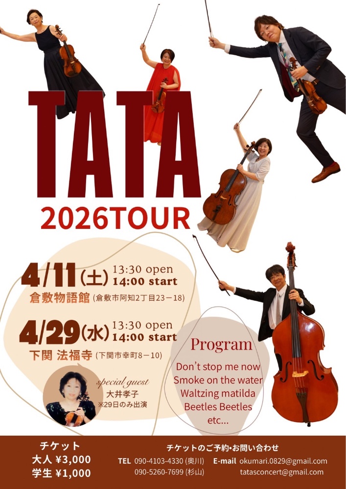 tata ツアー 20262026年4月11日(土)14:00〜倉敷物語館2026年4月29日(水)14:00〜山口県下関市 法福寺